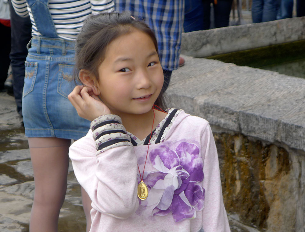 Nästa dag skulle vi titta på Longmengrottorna vid Yifloden. Vid busshållplatsen fotograferade jag söta ungar. Det var så enkelt i Kina. Ingen blev sur, tvärtom verkade alla glada över uppmärksamheten.